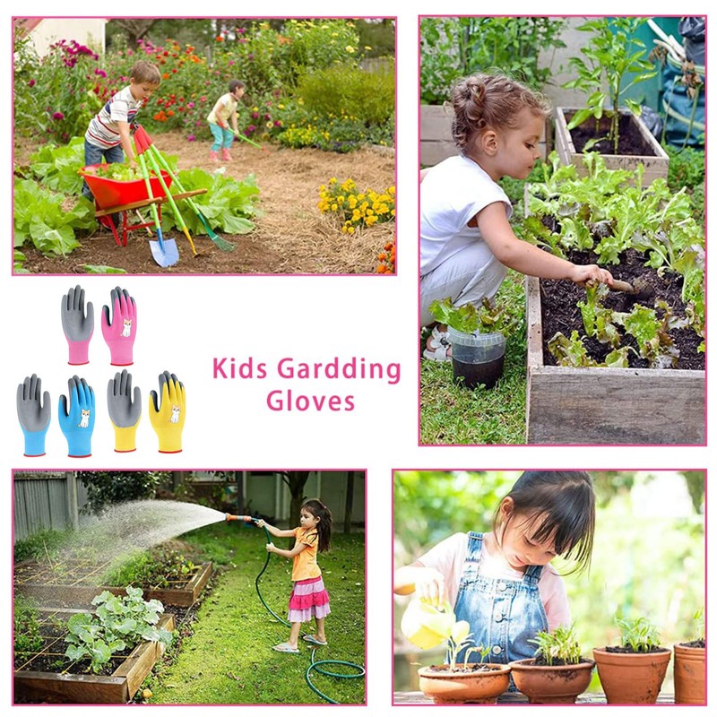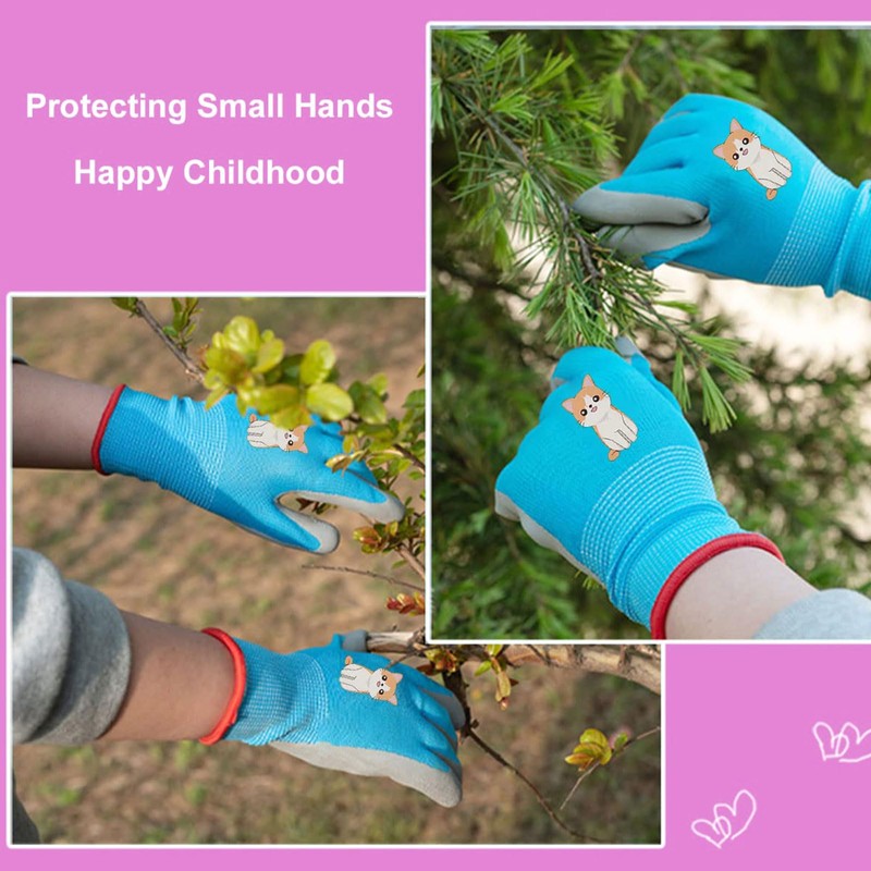 - GARDENING WORK GLOVES FOR KIDS You will get three pairs of gloves with yellow, blue and pink cat prints, suitable for children aged 8-10 years with high safety. Perfect gardening gloves for your children to enjoy outdoor work. These kids gardening gloves ensure your child's hands are safe and clean.