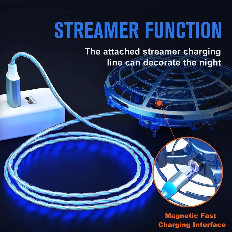 • 🎁UPGRADED MOTOR CORE AND MAGICAL CHARGING CABLE: The motor of the UFO drone uses high quality motor cores, which make the drone more stable during flight. The hand operated drone is equipped with a magnetic suction streamlined fast charging cable, which can charge the hand operated drone faster. At night, it will become a blue water Flowing effect magical line, as if energy is continuously being delivered to the UFO drone, which make your children love the hand operated drone even more.