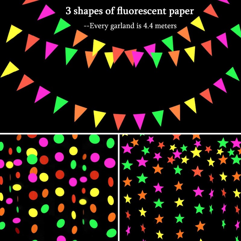 • ✅【QUANTITY & SIZE】:The diameter of each circular fluorescent paper is 5cm/1.97inch, the length of each pentagram is about 7cm/2.75inch, and the size of each triangle flag:8*12cm/3.1*4.7Each garland is approximately 4.4 metres long. You will receive a total of 45 circle points, 40 stars and 33 triangle flags.