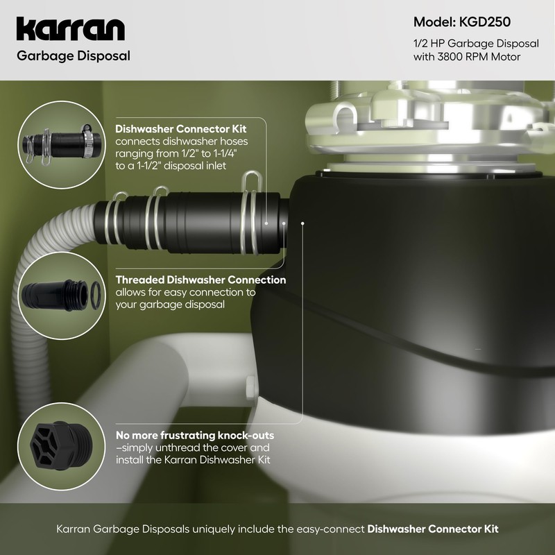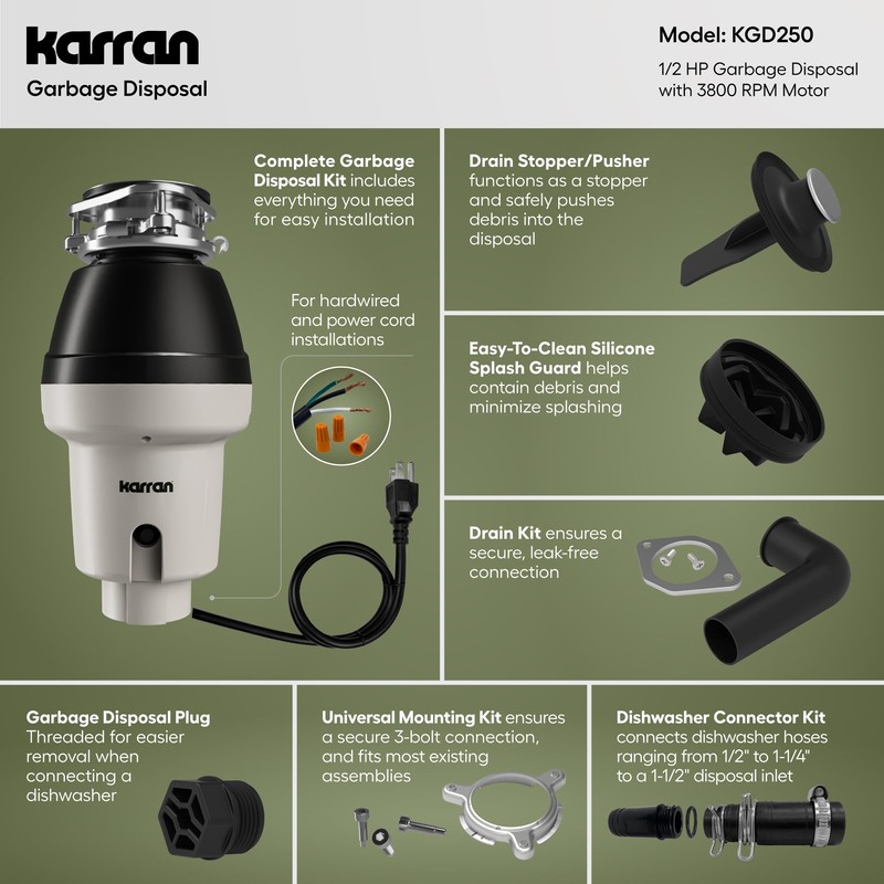 Karran 1/2 HP Continuous Feed Garbage Disposal for Kitchen Sinks with Power Cord and Accessories Included