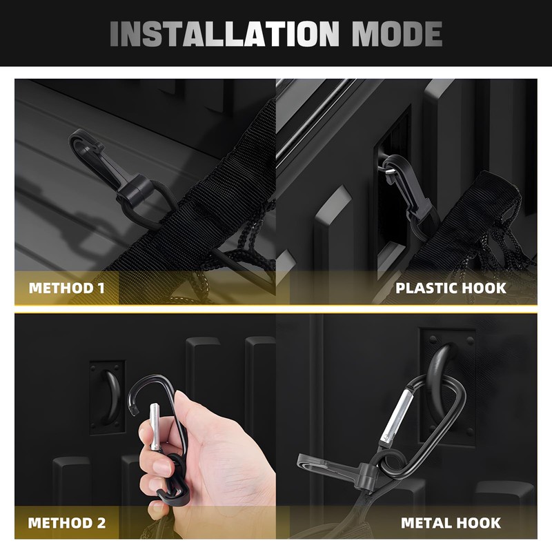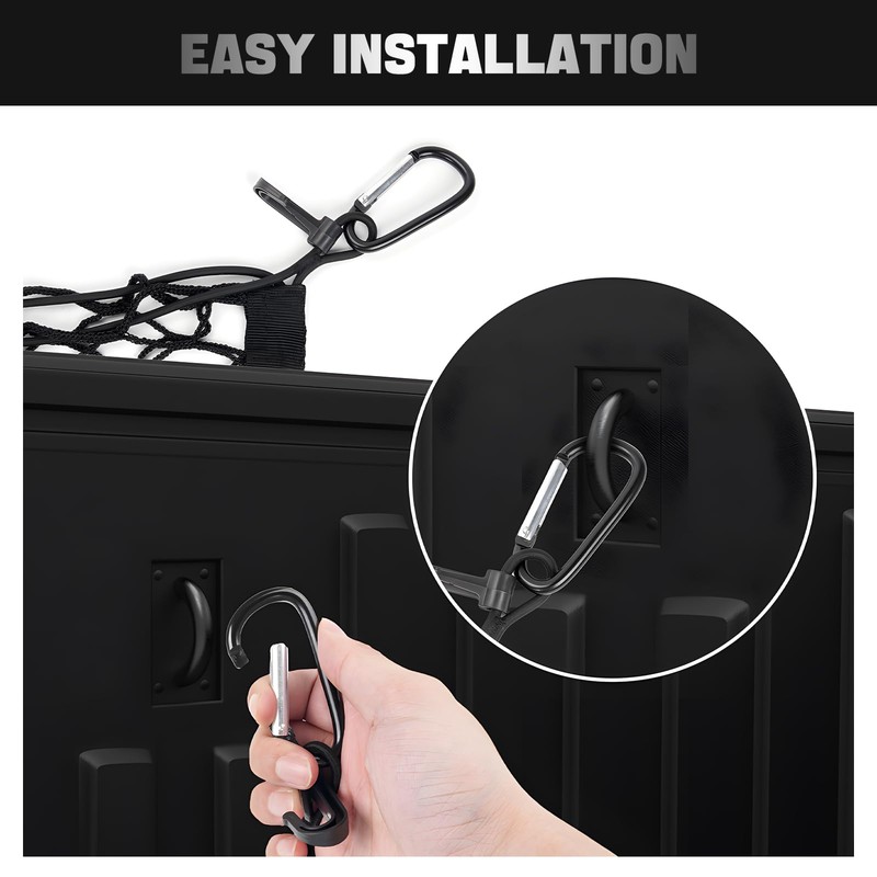 - Install in Seconds: This cargo net for pickup truck bed is Straightforward and hassle-free installation. Comes with 4 strong carabiners, so can just attach the luggage net to mounting points in the rear cargo area. The mesh rear cargo net hooks on and off quick and easy. And just folds flat to store in very little space when not in use