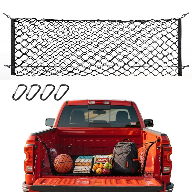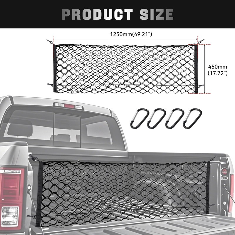 - Durable & Stretchy: Our truck bed cargo netting is made of premium Nylon material with Carabiner and plastic hooks, Highly Elastic, Ample Coverage. Well made double layer mesh design makes it more durable and stretchy. Non-toxic, Stain Resistant, Strong and Durable, Practical & Useful to keep your trunk organized and belongings secure