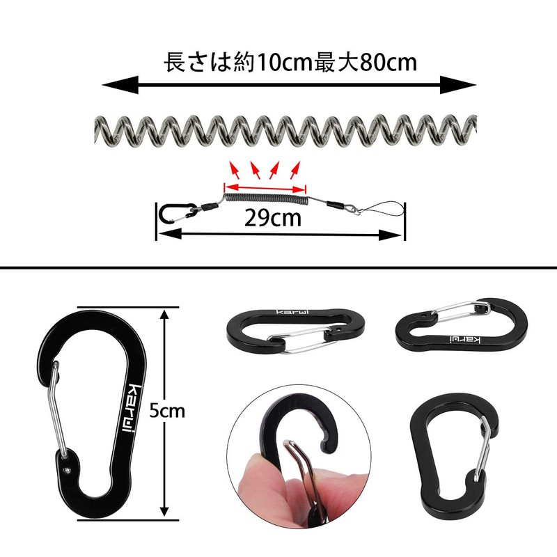Karui Curl Cord Strap, Coil Strap, Stretchable, Carabiner, Smartphone, Cell Phone, Periodically, Fall Prevention, Theft, Loss Prevention (Set of 2), Alloy Steel Aluminum Stainless Steel, No Gemstone