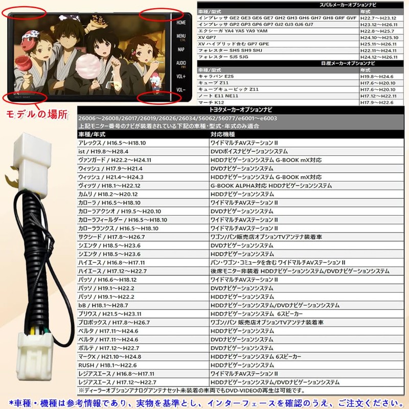 - [Compatible models] Compatible with dealer options such as Toyota/Avalon/Lexus/Sienna/Subaru/Camry Please check the coupler shape and navigation model before purchasing. This is a guideline for compatibility, so please check compatibility based on your car model and year specified on your vehicle verification stated