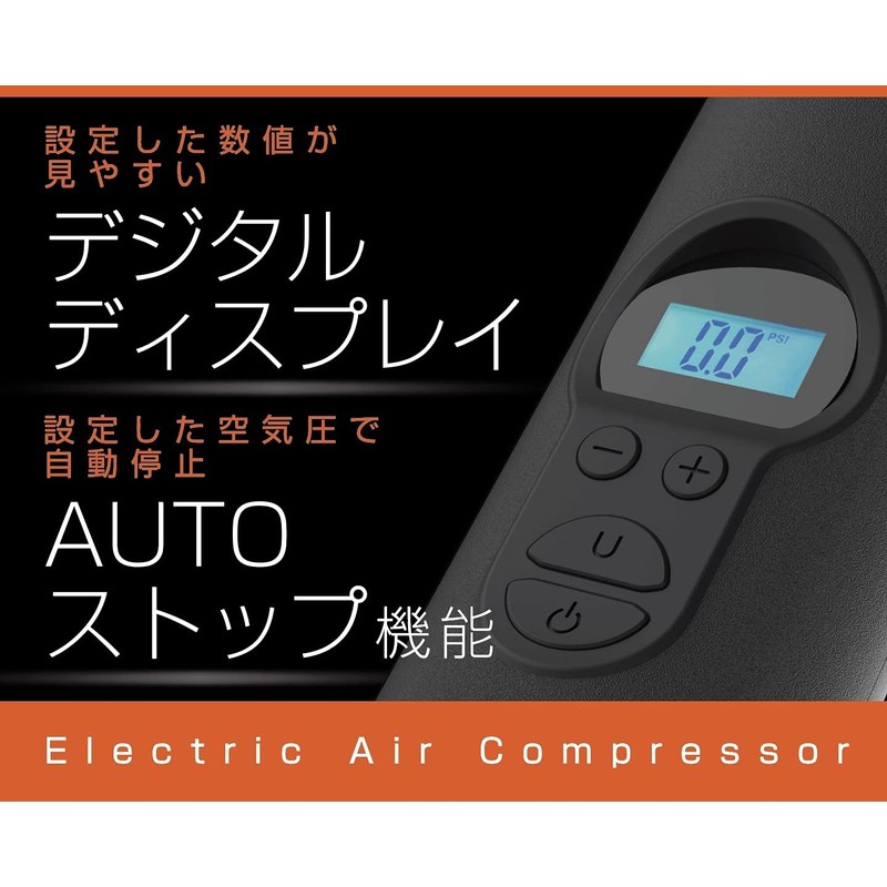 - Automatically stops at the specified air pressure. An electric compressor that is convenient for regular tire pressure management