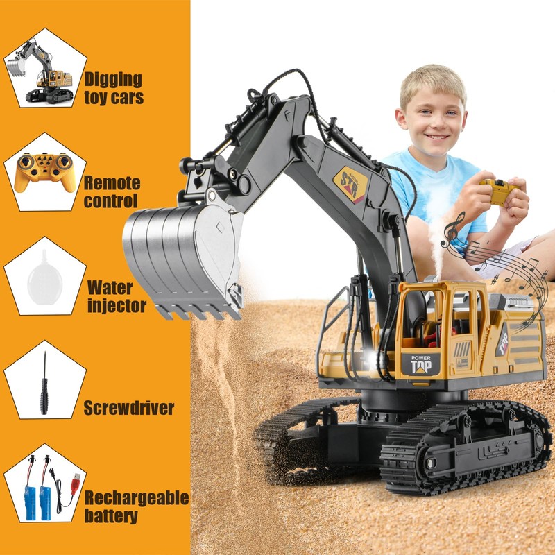 • 【1:14 Simulated Digger Toys】: This remote control excavator is made of high quality ABS plastic and alloy. The simulated alloy shovel, hydraulic arm,simulated smoke,sound , lighting, realistic cab and elastic rubber tracks are exquisite. This remote control truck helps improve kids' hand-eye coordination and inspire thier thought of engineer during playing. If you are looking for an exciting and cool christmas gifts for kids, you can't miss remote control excavator toy.