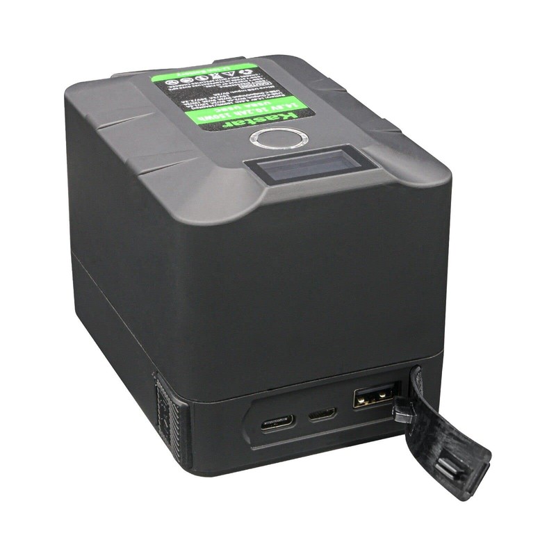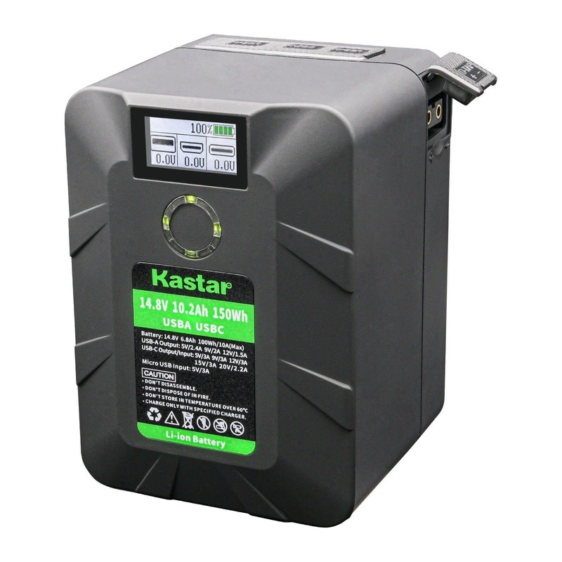 - The Kastar V-Mount battery only about 26.4 Oz, 4" x 2.8" x 3" (102 x 72 x 75.5 mm), it is a compact battery, portable for on-the-go shooting. Easy to pack and portable for use; Battery Type: Li-ion, Battery Voltage: 14.8V, Battery Capacity: 6.8Ah/ 100Wh. With OLED display, it can display battery voltage, capacity and USB output voltage.