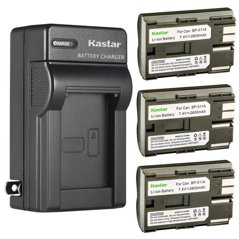Kastar 3 Pack BP-511 BP-511A Battery and AC Wall Charger Compatible with Canon EOS 5D EOS 10D EOS 20D EOS 20Da EOS 30D EOS 40D EOS 50D EOS 300D EOS D30 EOS D60 EOS Kiss EOS Kiss Digital Cameras