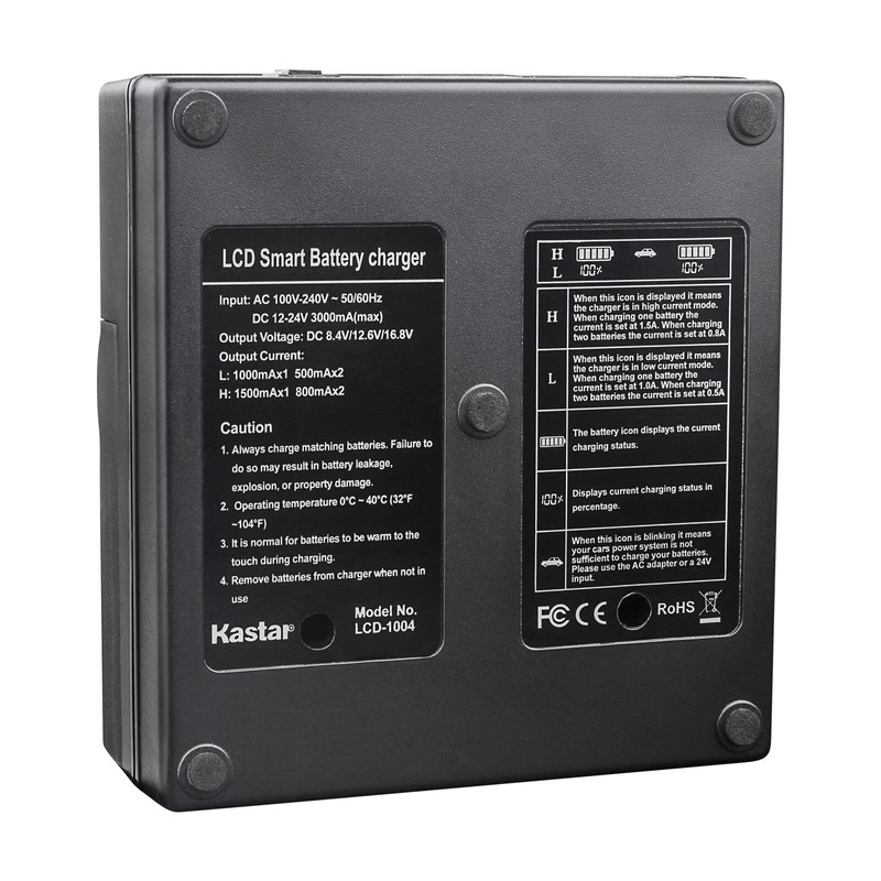 - Kastar LCD dual fast charger, Input: AC 100V-240V 50/60Hz 1500mA(max.); DC 12-24V 3000mA(max.). Output Voltage: DC 8.4V; Output Current: 1000mA *2.