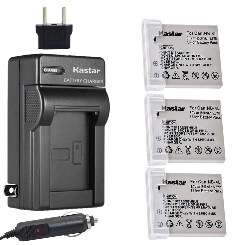 Kastar Battery (3-Pack) and Charger Kit for Canon NB-4L, CB-2LV work with Canon PowerShot SD40, SD30, SD200, SD300, SD400, SD430, SD450, SD600, SD630, SD750, SD780 IS, SD940 IS, SD960 IS, SD1000, SD1100 IS, SD1100 IS, SD1400 IS, TX1, ELPH 100 HS, ELPH 30