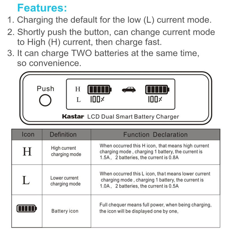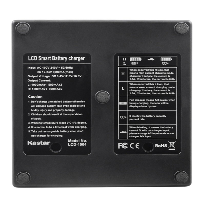 - Intelligent Dual Fast charger LCD displays charging status, battery capacity, it can charge two batteries at the same time, change different plate, suitable for most of digital batteries.