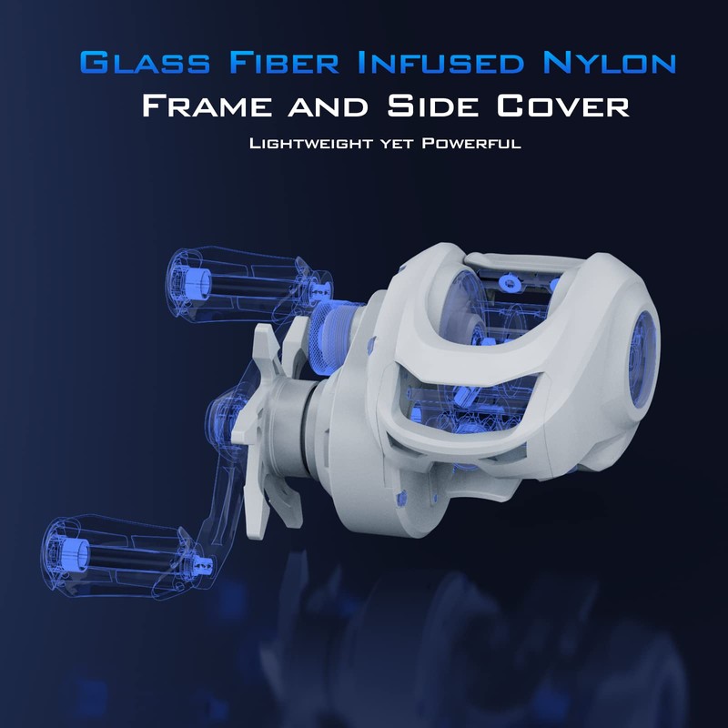 - LIGHTWEIGHT – Weighing in at only 7.6 ounces, the Centron Lite Baitcasting Reel has a narrow, Glass Fiber infused Nylon frame that is ultra-light and ultra-powerful. The compact size low profile baitcaster fishing reel is ergonomically designed for comfort.