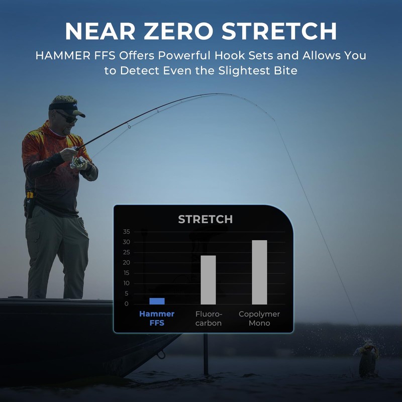 - NEAR ZERO STRETCH: With a stretch factor of less than 4% at its breaking point, Hammer FFS braided fishing line offers powerful hook sets and allows you to feel even the slightest bite