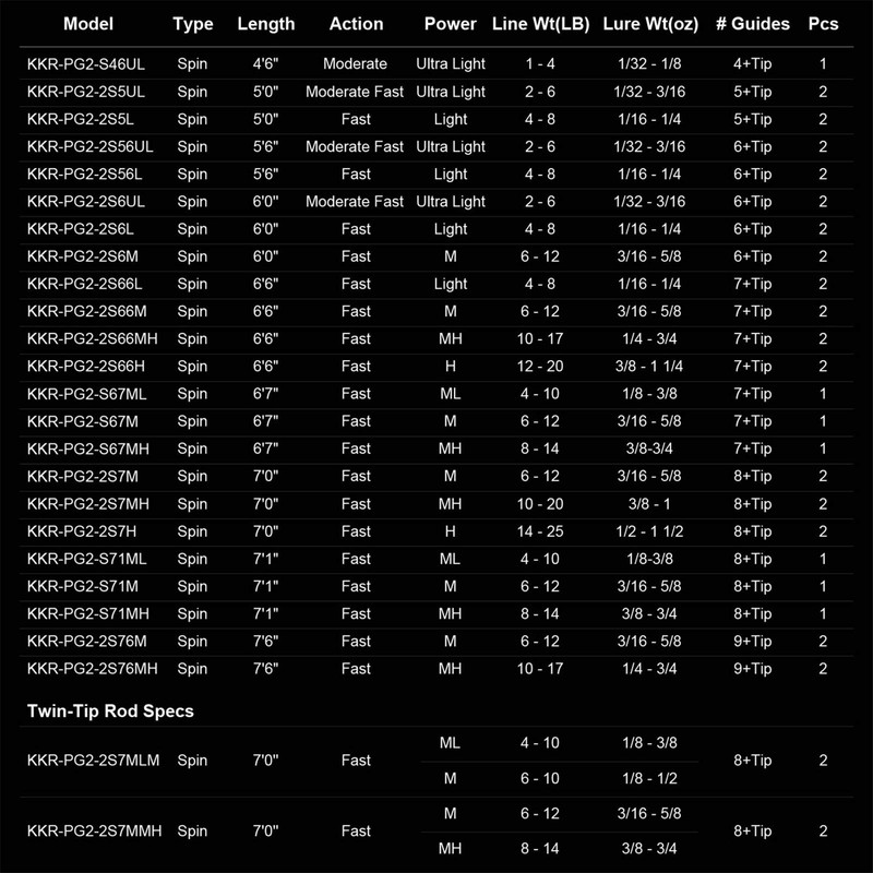 - Amazing Quality Carbon Fiber Blank - All Perigee II two-piece fishing rods are constructed with Toray 24-ton carbon matrix KastFlex blank technology for power, strength, and accuracy. Available in 42 sizes from an ultra light spinning fishing rod to a heavy 7’ spinning rod and a baitcaster rod ranging from medium to heavy power. Use them for bass fishing rods, trout fishing, walleye fishing, or as a salmon rod, catfish rod, steelhead rod, or saltwater fishing rod.