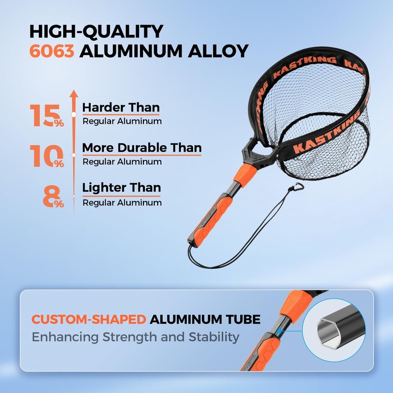 - Durable & High-Strength Design: The KastKing Titanet landing net is built with a high-quality 6063 aluminum alloy handle featuring a custom-engineered aluminum tube profile for superior strength. A durable molded locking head and locking collar keep the net secure and ready to use, making it perfect for landing trophy fish.