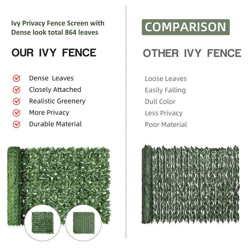 - Realistic Green Ivy Look:Realistic Green Ivy Look: All the leaves of the green faux ivy leaf decorative privacy fence screen are with stamped texture, the leaves are very realistic and textured. Its texture is also real in terms of sight and touch. Provide every indoor or outdoor space with a evergreen look year-round.