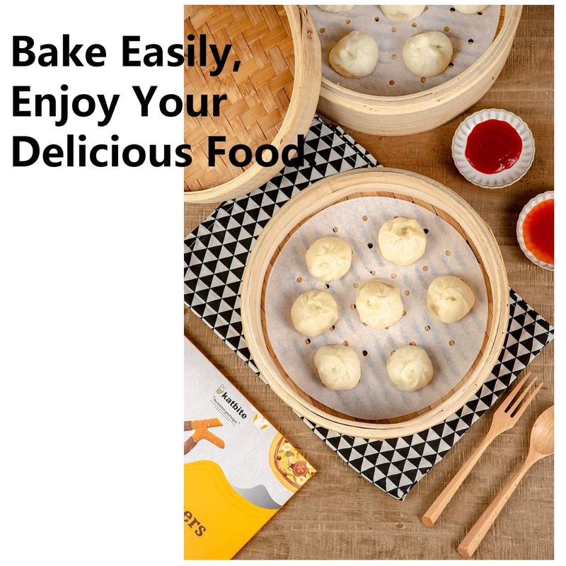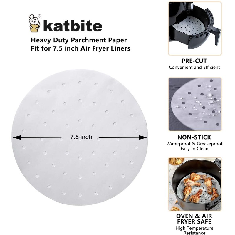 - 🍟ENSURE STEAM CIRCULATION - Katbite air fryer parchment paper liners are professional designed for air fryer. Enough and proper holes help to speed up the steam circulation in air fryers or steamers, allowing the food to be fully heated evenly without affecting the quality of the cooking. Bring you a good taste!
