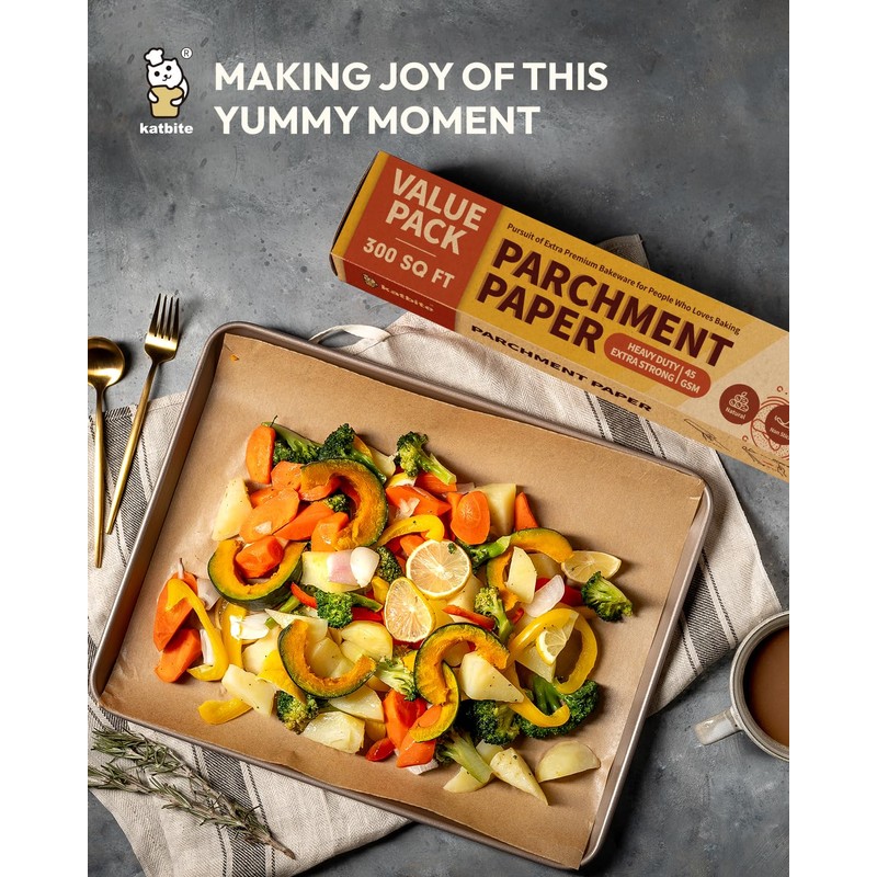 - EXTRA LONGER WITH SERRATED CUTTER: Katbite parchment paper roll with sharp serration can be used for half sheet or full sheet baking pan. 15in x 242ft parchment baking paper can be cut into any sizes you want, its adaptability is very good. Serrated cutter that comes with the box can help you cut freely and quickly, no need to cut with scissors, very easy to use. With a total in 300 SQ FT, longer meters & non-stick, very durable and useful.