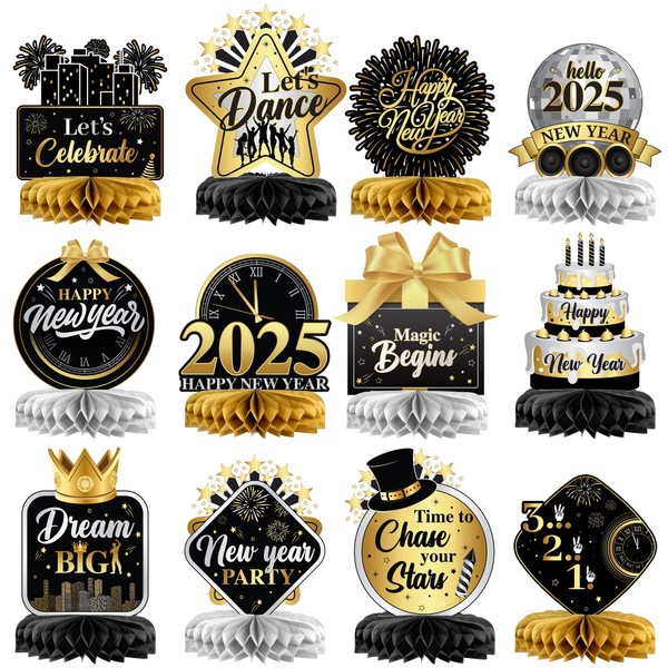 - BEAUTIFUL 12 DIFFERENT VARIETY OF GLITTER NEW YEAR HONEYCOMB : Looking for new years eve centerpieces 2025? We have got you covered with this New Years Eve centerpieces decoration or new years eve table decorations set that includes the adorable pack of 12 New Years Honeycomb in black and gold. You will receive 12 set of glitter new year honeycomb centerpiece decorations in different designs, including 12 honeycomb centerpieces, very suitable for happy new years table decorations.