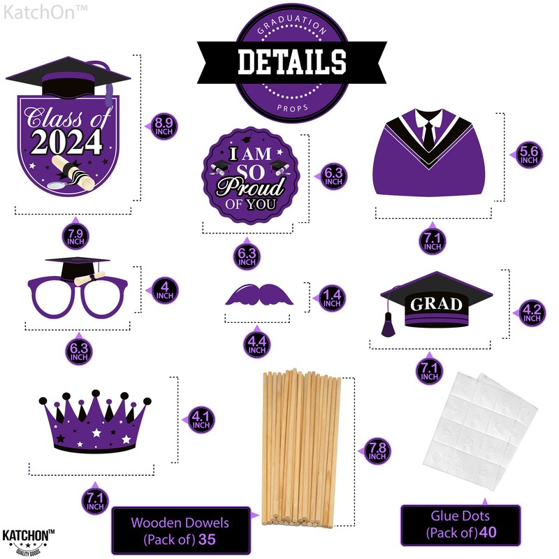 - EASY TO ASSEMBLE | LITTLE DIY REQUIRED : These purple graduation decorations class of 2024 with 35 different props for 2024 graduation decorations. Easy to assemble, simply attach the included bamboo dowels to each card stock purple grad photo props 2024 purple and gold & hold up in front of your face. Excellent 2024 graduation props, purple class of 2024 decorations. Make a statement in your graduation with our eye-catching graduation props for photoshoot.