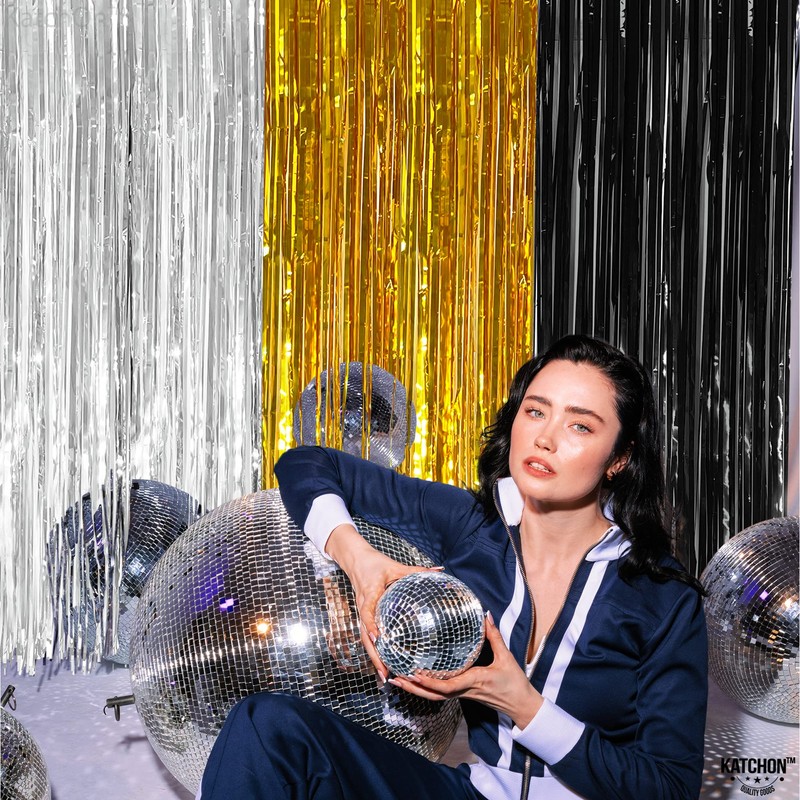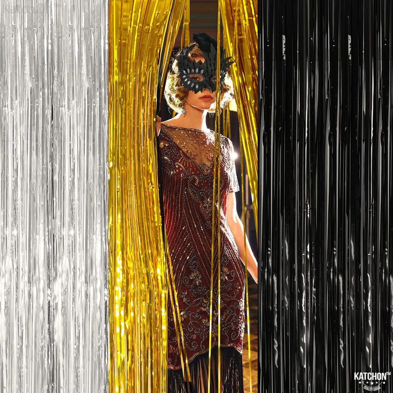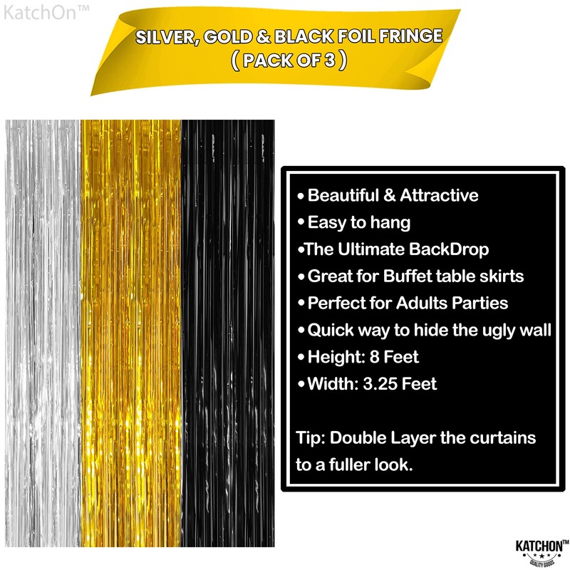 KatchOn, Silver, Black and Gold Backdrop - 9.6x8 Feet, Pack of 3 | Shiny Silver, Black and Gold Streamers Backdrop, Nye Decorations 2024 | New Years Backdrop | The Notorious One Birthday Decorations