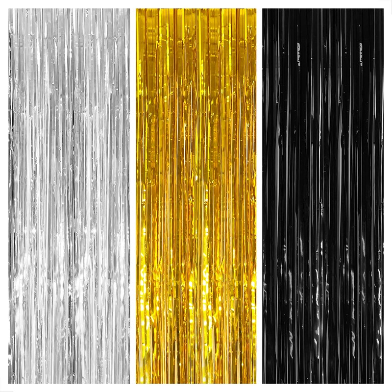 - XTRA LARGE, 9.6X8 FEET | PACK OF 3 - Thinking about what to add on your party backdrops? This package contain pack of 3 silver, black and gold streamers backdrop, new years eve decorations with total size of 9.6x8 feet, will be the most highlighted item in your black gold and silver party decorations. With this gold, black and silver door streamers and a touch of your creativity you can make an elegant backdrop for the notorious one birthday decorations, new years eve party supplies 2024.