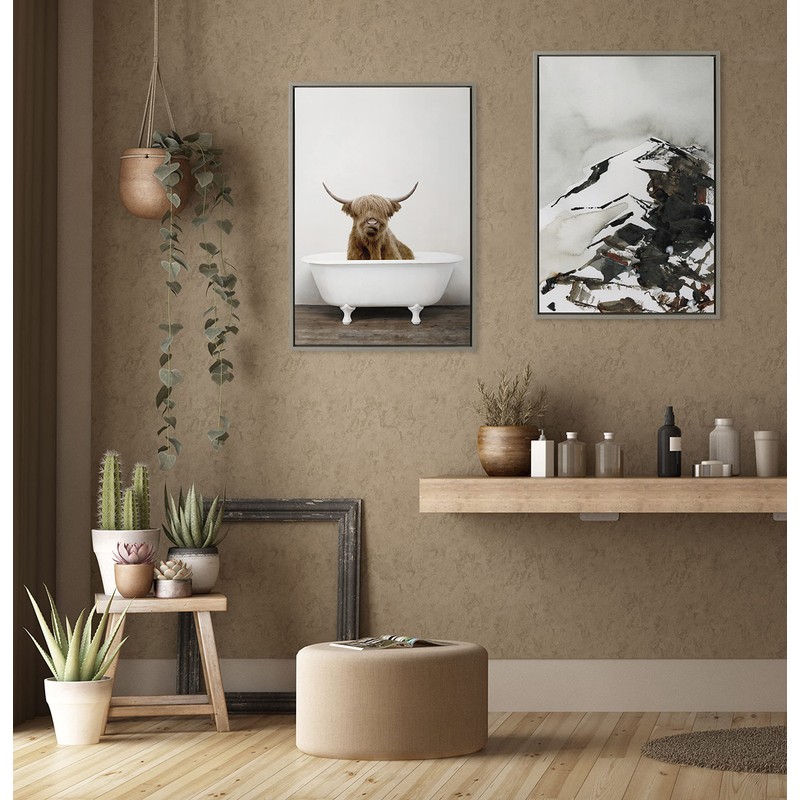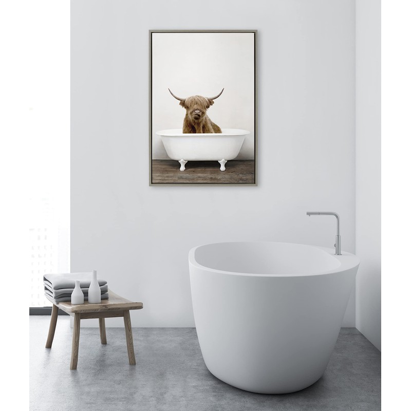 Kate and Laurel Sylvie Highland Cow in Tub Color Framed Canvas Wall Art by Amy Peterson Art Studio; 23 x 33; Gray; Farmhouse Inspired Animal Art for Wall