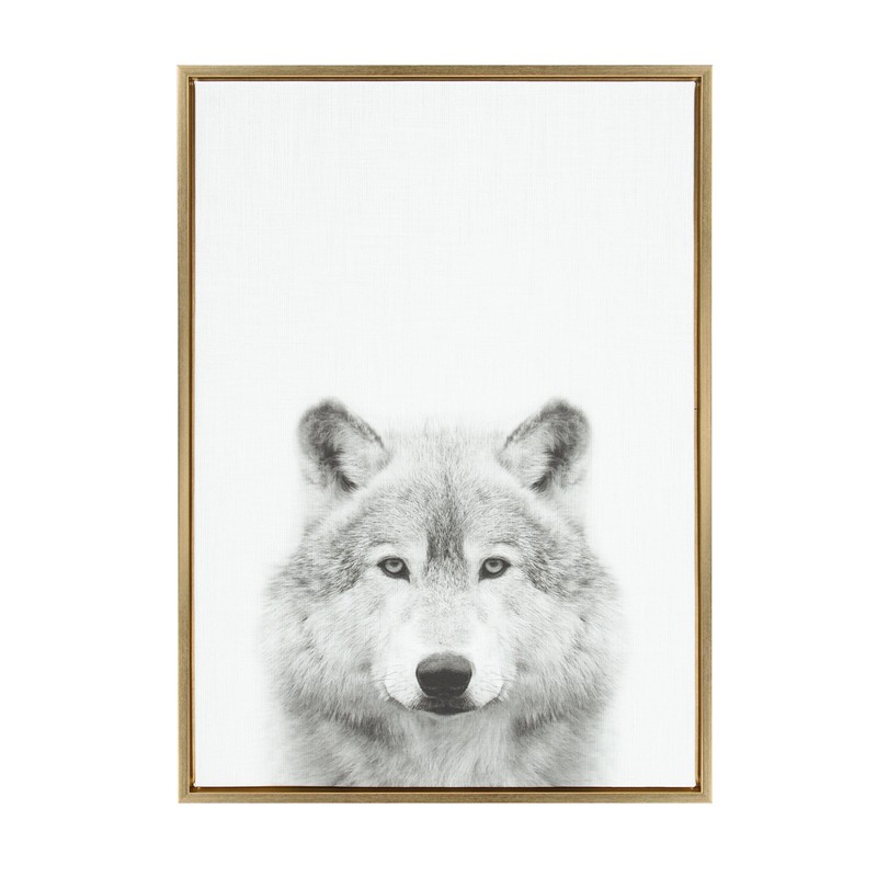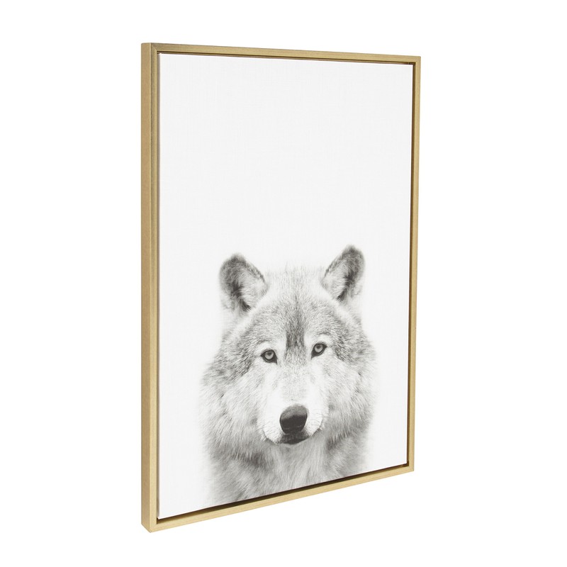 Kate and Laurel - Sylvie Wolf Animal Print Black and White Portrait Framed Canvas Wall Art by Simon Te Tai, Gold 23x33