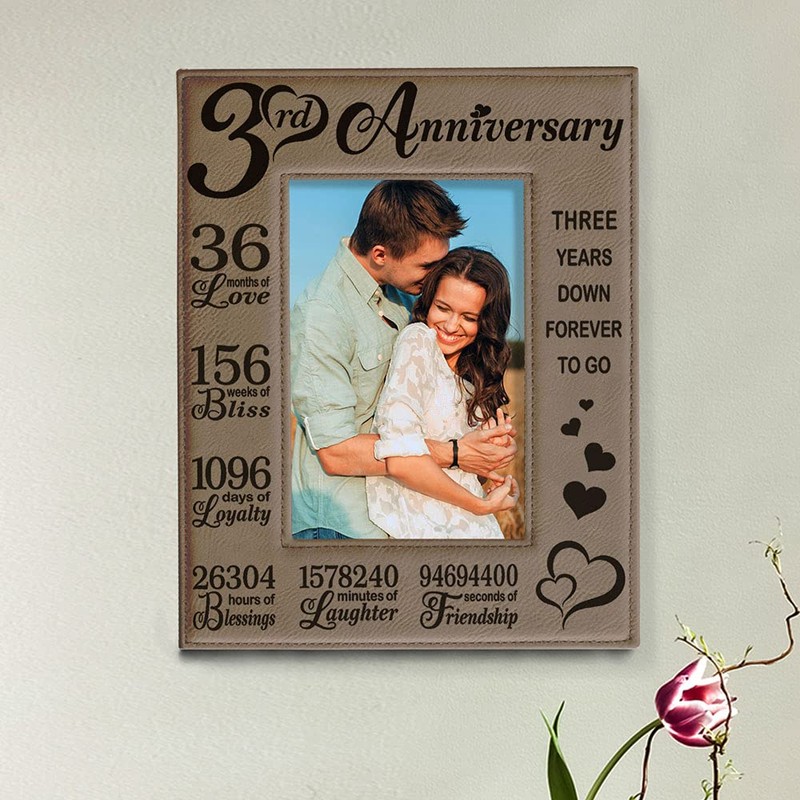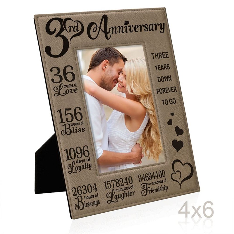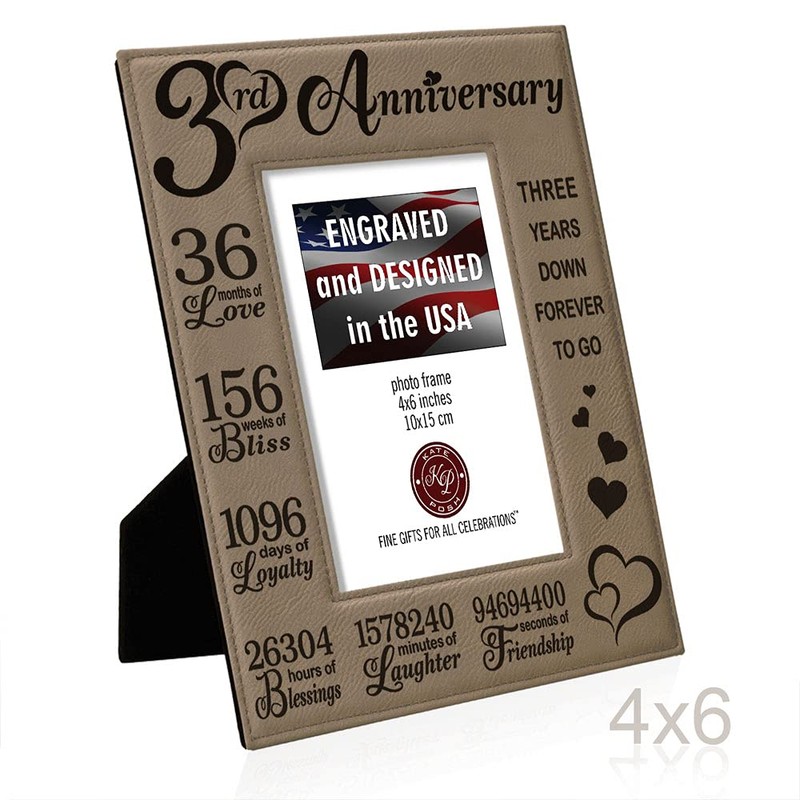 KATE POSH Our 3rd Wedding Anniversary, 3 Years Anniversary, 3 Years of Marriage, Gifts for Couple, Third Anniversary - Engraved Leather Picture Frame (4 x 6 Vertical)