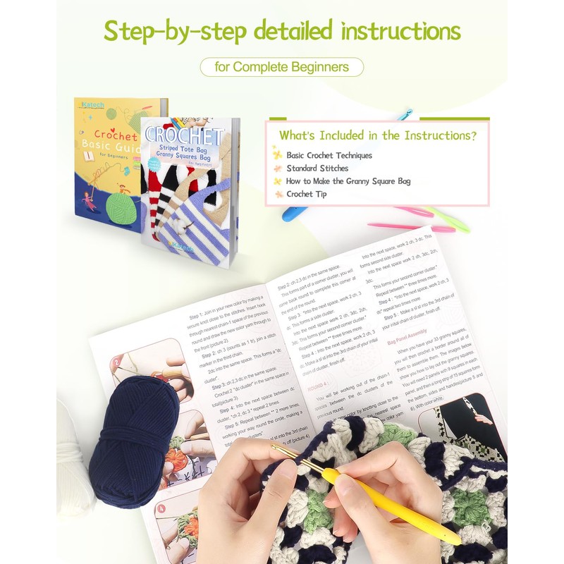 Katech Crochet Set for Beginners, Crochet Set for Bag from Granny Squares, Crochet Set Knitting for Beginners Set with Step-by-Step Instructions, Crochet Accessories, Crochet Hook 3.5 and 4.0 mm,