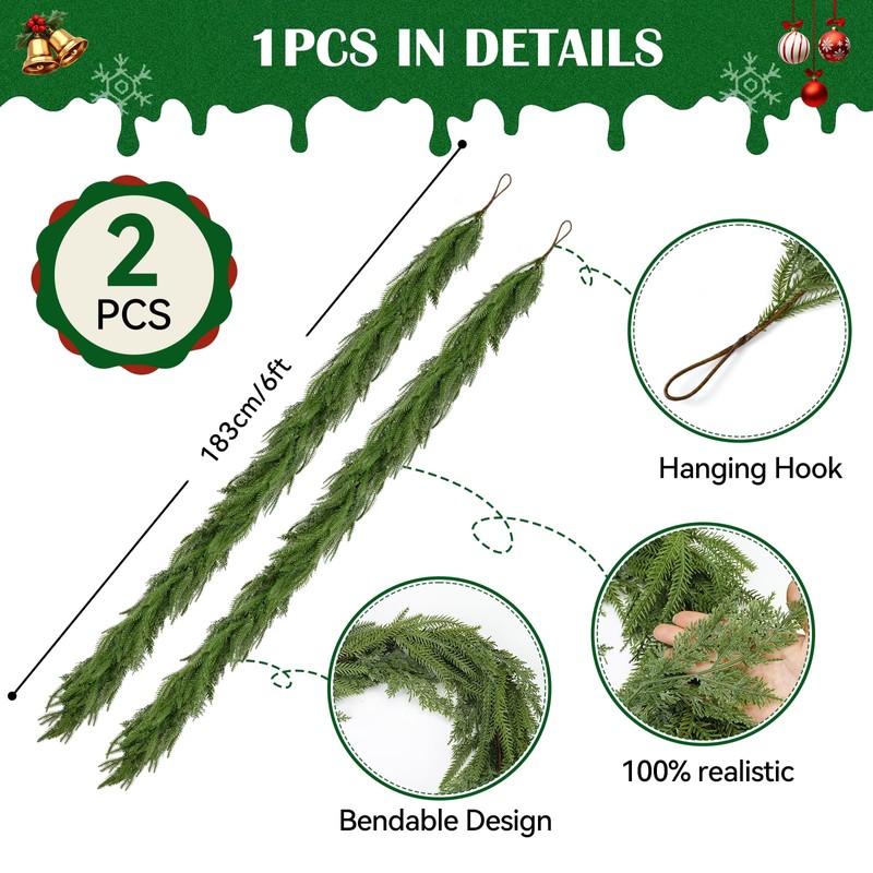 - Length & Fullness: Package include 2pcs artificial pine garlands. The green garlands measures about 6 feet (183cm) in length and 35 branches, which make them full and plump. The 2 set 6ft lengths will make a very nice accent for Christmas or winter decoration