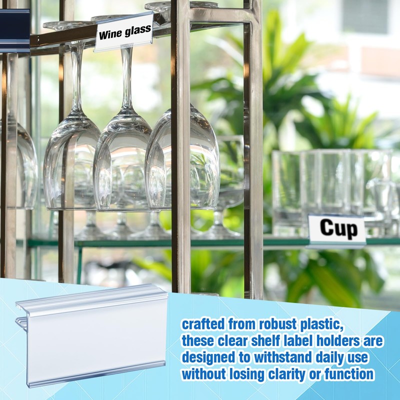• Durable Quality: crafted from robust plastic, these clear shelf label holders are designed to withstand daily use without losing clarity or function; They're the ideal choice for businesses seeking durable solutions for their glass shelf label holder needs