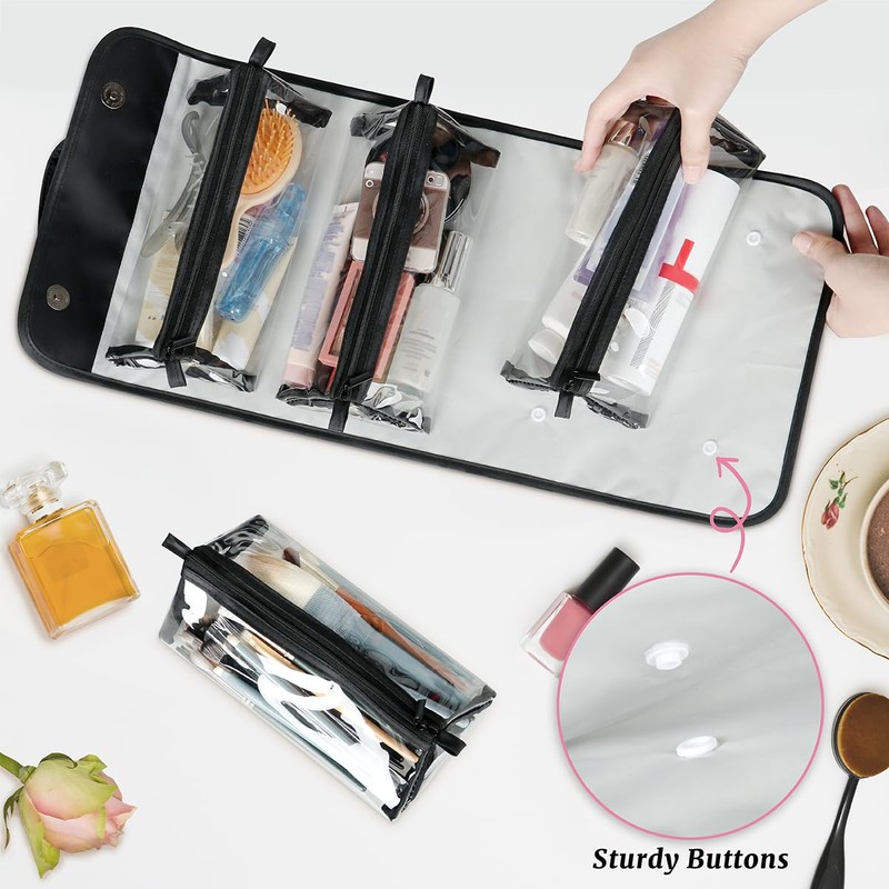 - 【Lightweight & Sturdy】 Roll-Up Makeup Bag is made of composite twill fabric, which has both softness and sturdy. The clear PVC materials of the compartments are waterproof and not easy to deform, can keep your items dry. Sturdy buttons as links are strongly viscous to ensure the PVC pouches will not fall off