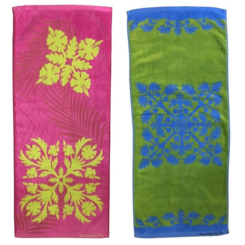 This is a face towel produced by Hawaiian quilt author Kathy Nakashima. A stylish Hawaiian quilted face towel with vibrant colors. Made of non-twist yarn and shirred for a fluffy and soft texture.