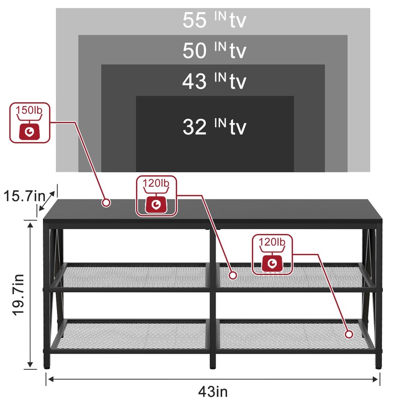 - The size of the TV stand is 43*15.75*19.69 "/110*40*50(length * width * height CM), suitable for 32-60 inch TV. Suitable for living rooms, bedrooms, etc. Weight capacity is 150 LBS. Two storeys of open space can hold more items, and the grid design can better ventilate and dissipate overheating of electronic products such as chassis or stereo.