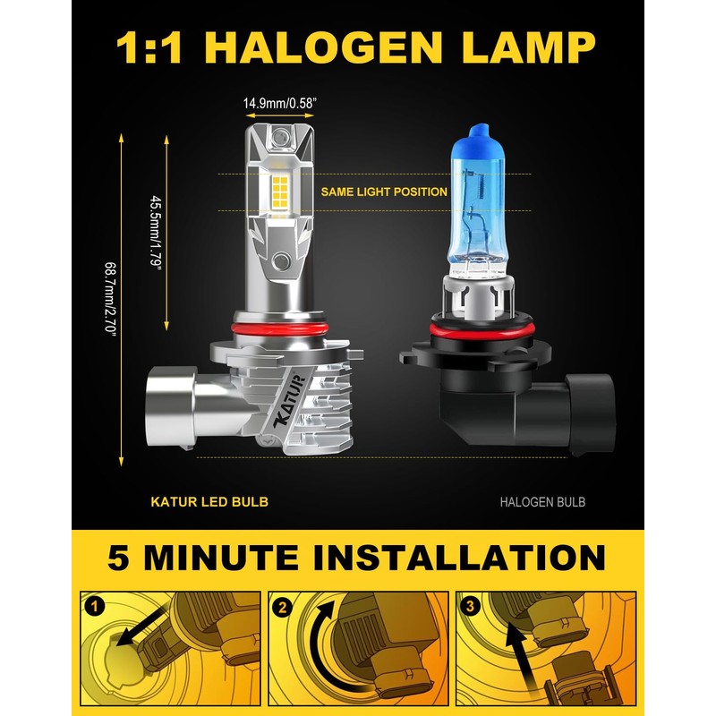 - ★【Easy Installation In 10 Mins】KATUR 9005 HB3 LED bulbs adopt 1:1 all-in-one mini halogen design, real plug and play. No plastic plug, no bulky and extended bulb base, no external driver, smoothly fits into vehicle's housing and factory sockets even with limited space in original housing before. Easy to install, save your space and time.