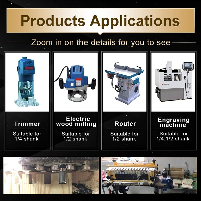 ▶ Please note: Please choose a 1/2 inch shaft version when working with materials with high hardness. Make sure your router speed starts at 15000 rpm when using these series router bits to prevent bending of the shaft. You can accelerate up to 20000 rpm if the material is not too hard.