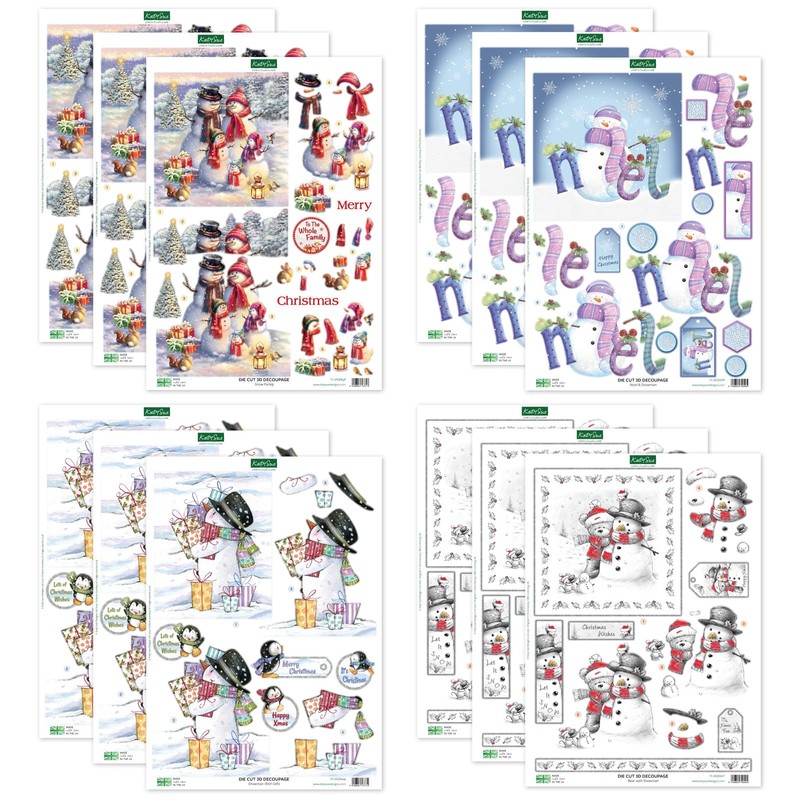 - CONTENTS: 12 SHEETS OF KATY SUE CHRISTMAS DIE CUT DECOUPAGE IN TOTAL - Made up of 3 SHEETS of 'Snow Family' die cut decoupage, 3 SHEETS of 'Noel and Snowman' die cut decoupage, 3 SHEETS of 'Snowman with Gifts' die cut decoupage & 3 SHEETS of 'Bear and Snowman' die cut decoupage.