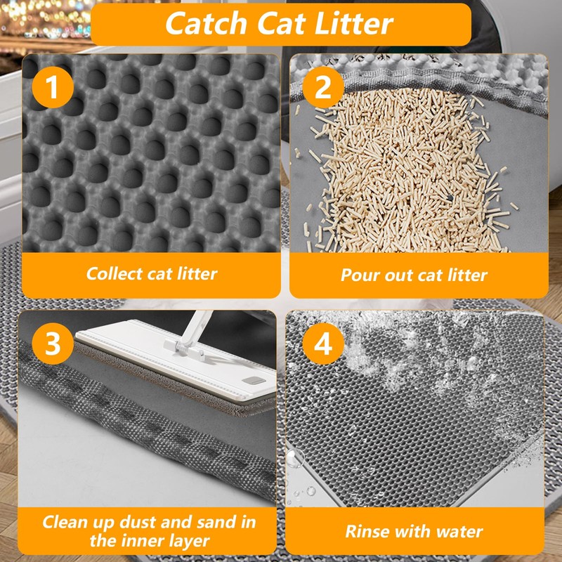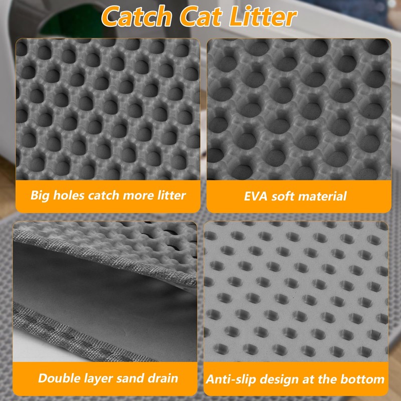 - Doppelschichtiges Wabendesign: Mit seiner einzigartigen zweischichtigen Wabenstruktur kann katzenstreumatte leicht und effektiv heruntergefallenen Sand auffangen und das Spritzen von Katzenstreu kontrollieren, sodass der Boden sauber bleibt. Heben Sie einfach die Matte an und lassen Sie das Katzenstreu fallen, sodass Ihr Platz mit minimalem Aufwand sauber und ordentlich bleibt
