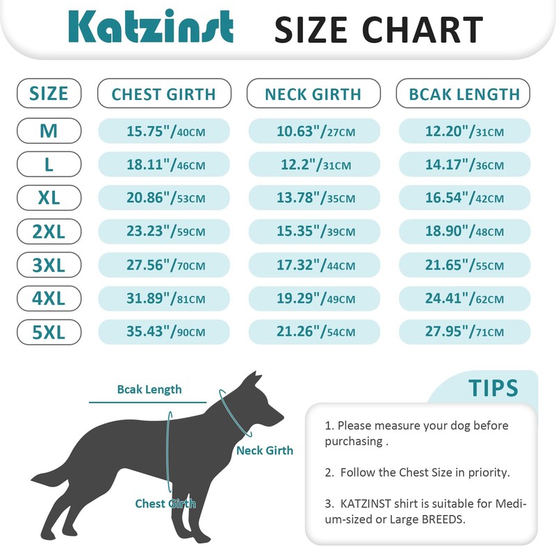 - Medium to large dogs: dog shirt comes in sizes from M, L, XL, 2XL, 3XL, 4XL, 5XL, very suitable for medium to large dogs. Please refer to the size chart before purchasing to make sure it fits your pet