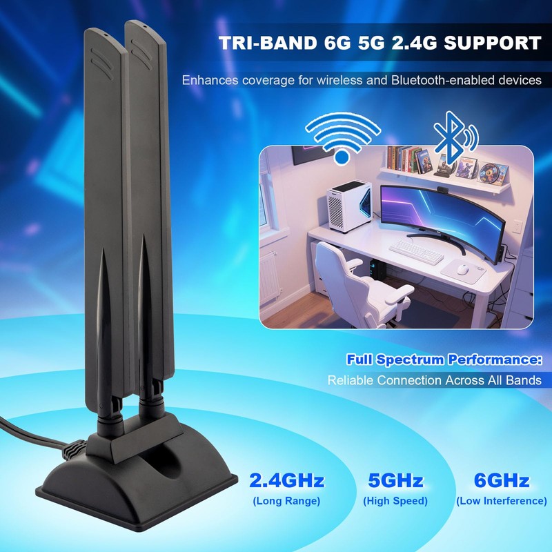 Whether you're upgrading your PC WiFi antenna, setting up a wifi antenna for desktop PC, or replacing your outdated bluetooth antenna, this is your go-to. Fully compatible with 802.11 a/b/g/n/ac/ax, WiFi 6, WiFi 6E, and even WiFi 7 antenna standards, it's the ultimate choice for blazing speed, low latency, and max stability.