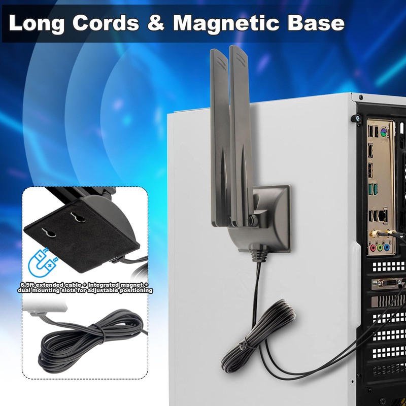 The magnetic base secures it easily to any metal surface for mess-free placement. Boost Your WiFi & Bluetooth Game Not just for WiFi—this antenna helps stabilize your Bluetooth signals too, giving you smoother streaming, cleaner audio, and faster pairing across all your connected devices. Perfect for... Everything Use it with PCIe WiFi cards, desktop computers, USB adapters, routers, access points, range extenders, and even IP cameras.