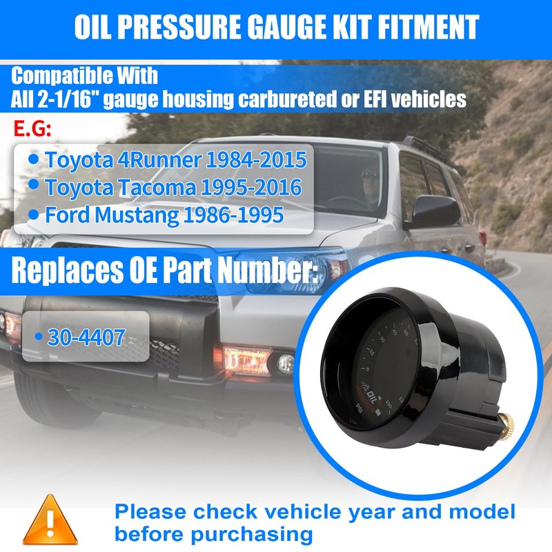 - 【Universal Fit】Replacing OE part # 30-4407, the 0-150PSI oil pressure gauge kit fit for all 2-1/16" gauge housing pods, ideal for both carbureted and EFI vehicles, E.G, compatible with Toyota 4Runner 1984-2015, Tacoma 1995-2016, compatible with Ford Mustang 1986-1995