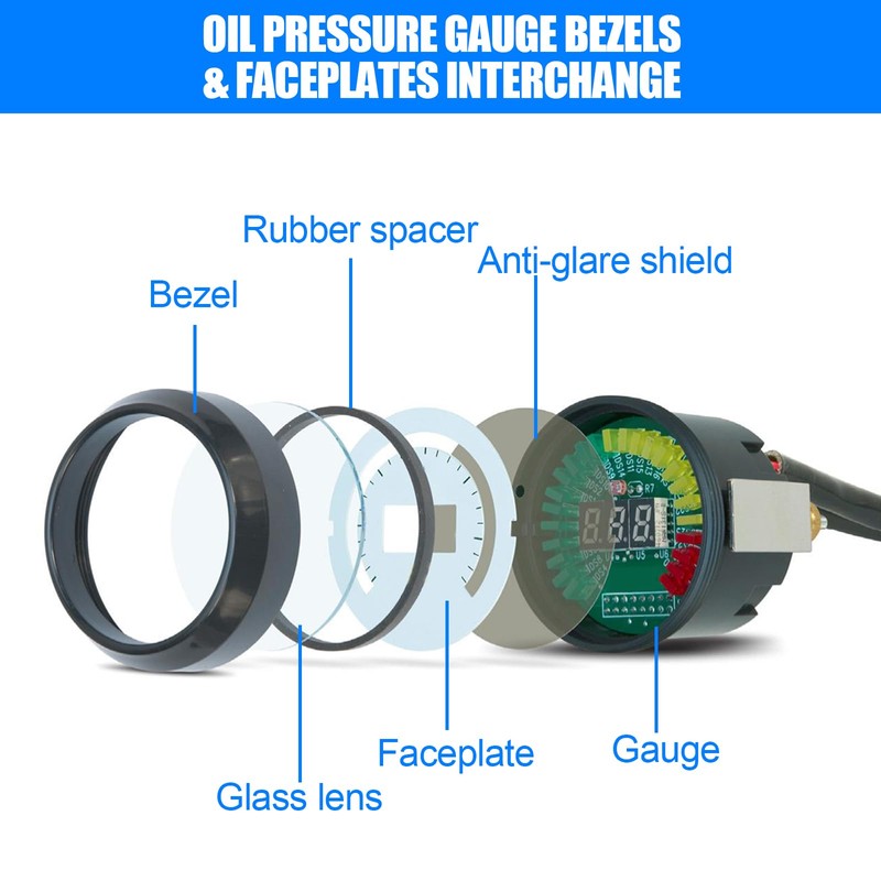 - 【Specifications】Gauge Type: Oil Pressure; Gauge Range: 0-150 PSI; Gauge Diameter: 2 1/16"(52MM); Sensor Thread Pitch: 1/8 in. NPT; Gauge Style: Digital; Sweep: Digital numeric; Gauge Backlight Color: Multiple; Gauge Needle Color: Multi Color Sweeping Led