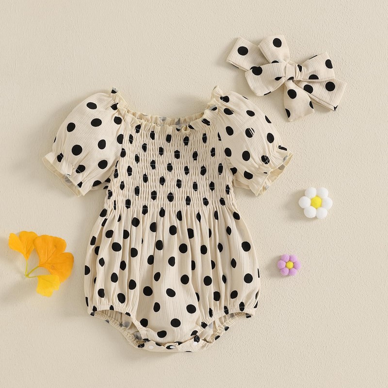 Baby Girls Summer Sweet Romper Short Sleeve Dot Print Romper with Headband