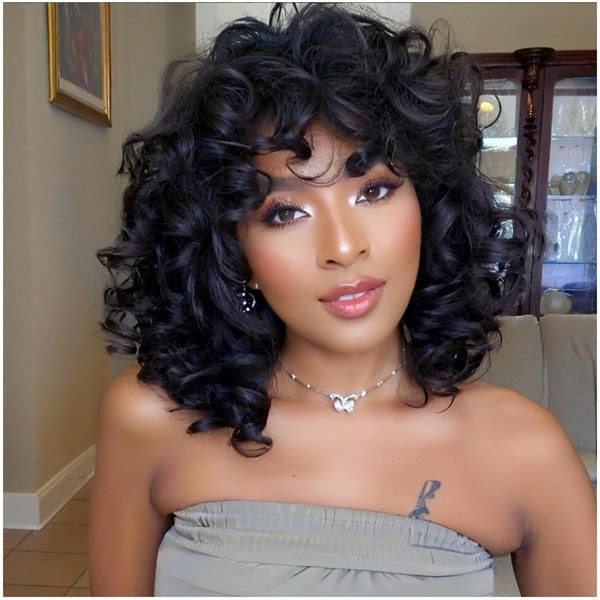 Kavsni Kavsni Short Curly Wigs for Black Women Soft Black Big Curly Wig with Bangs Afro Kinky Curls Heat Resistant Natural Looking Synthetic Wig for African American Women Black