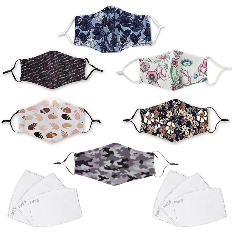 KaWaii Breathable Face Cloth Mask For Adult Men Women Senior Adjustable Reusable Washable Comfy Mask, Pack of 6 Masks + 6 PM2.5 Pads (Earthy Bouquet)
