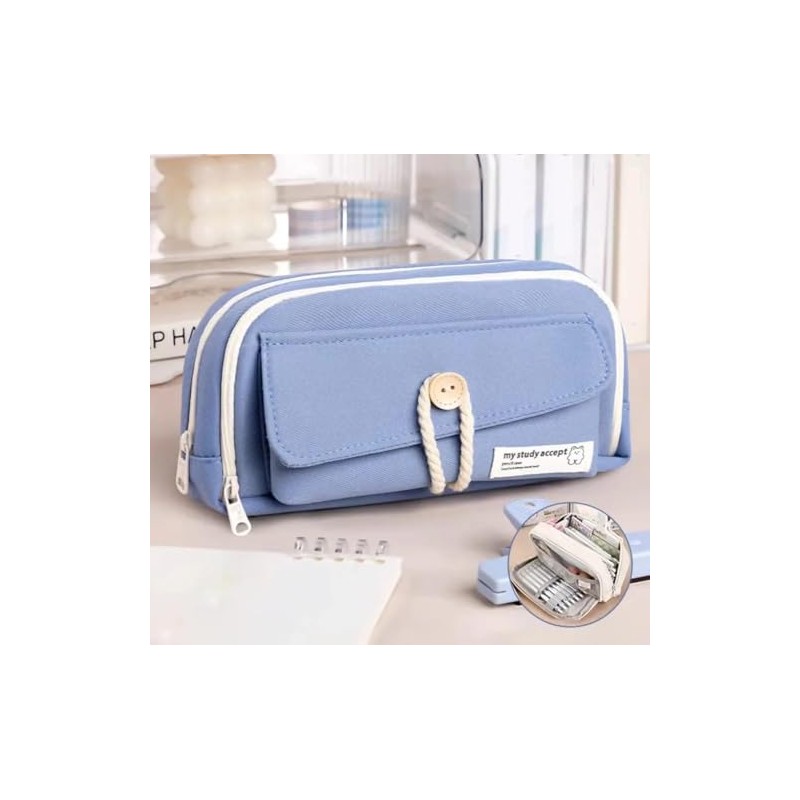 Kawaii Canvas Pen Pouch Bag with Large Capacity and Multi-Layered Organization (Lake Blue, One Size)