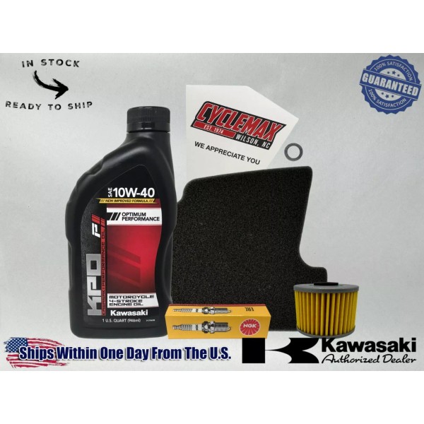 - CYCLEMAX OIL CHANGE KIT INCLUDES: One Kawasaki K61021-101-01Q KPO 10W40 Motorcycle Quart of Oil, One Kawasaki 52010-1053 Oil Filter, One Kawasaki 11013-0756 Air Filter, One CR6HSA NGK Spark Plug, One 12mm Drain Plug Crush Washer and a Convenient Disposable Funnel.