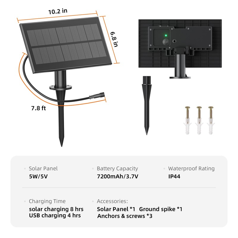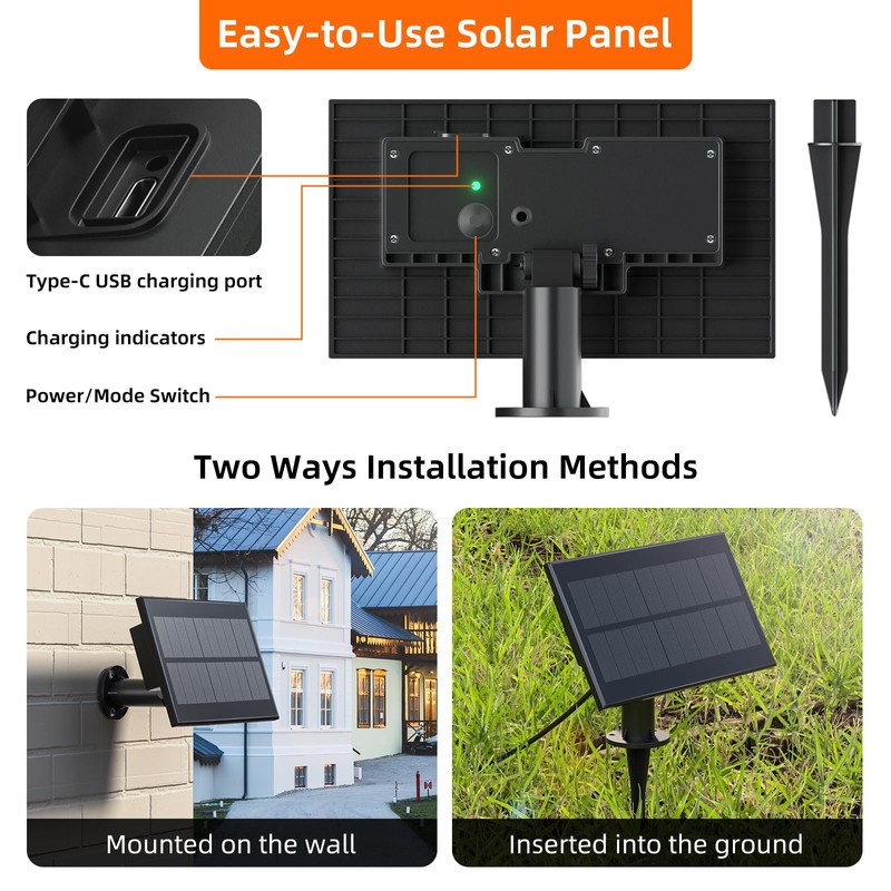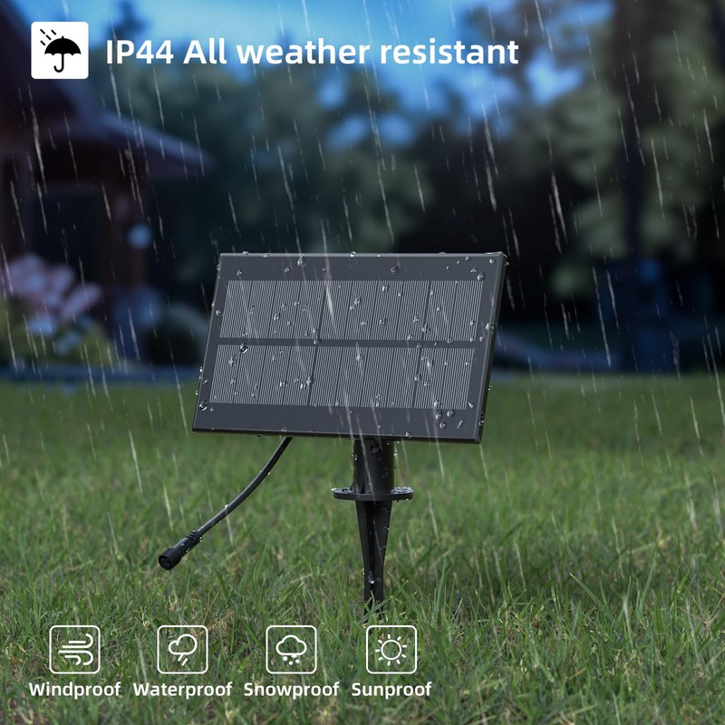 - EASY INSTALLATION AND IP44 WATERPROOF: The solar panels can be mounted on the wall or directly inserted into the ground, and the panel is IP44 waterproof rating, which can withstand extreme outdoor conditions,including rain, sunshine, wind, snow, and humidity.